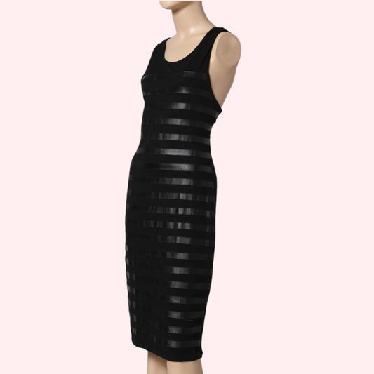 VINCE CAMUTO Black Sleeveless Midi Dress with Faux Leather Stripes
