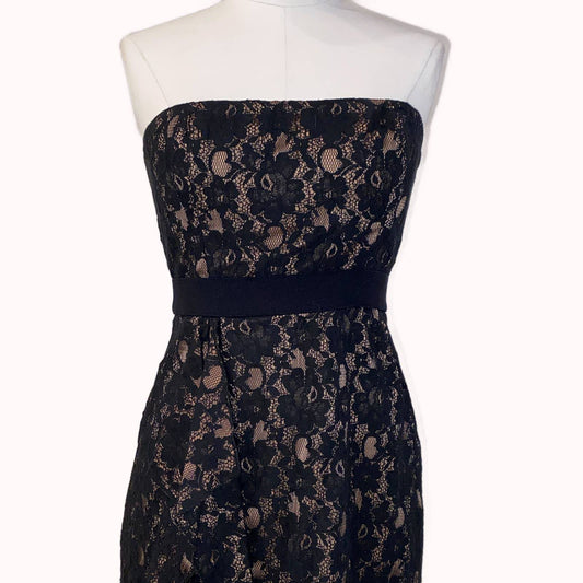 BCBGMAXAZRIA Black Lace with Cream Slip Strapless Midi Dress