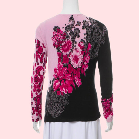 ALBERTO MAKALI Pink and Black Floral Print Scoop Neck Sweater