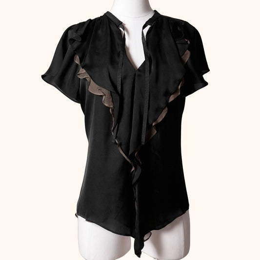 ZARA Vintage Black Ruffled Short Sleeved Silk Top