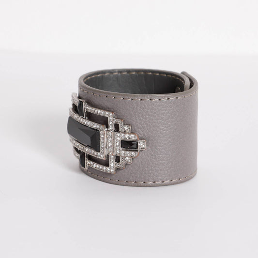 PLUMA ITALIA Gray Leather and Crystal and Stone Cuff Bracelet
