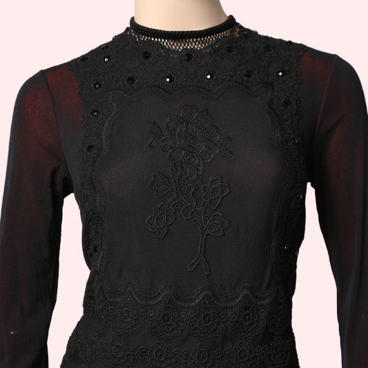 VIVIENNE TAM Black and Red Mesh and Lace Embroidered Long Sleeve Dress