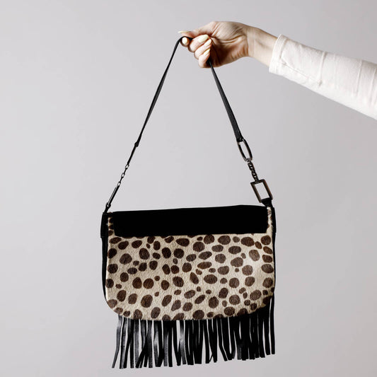 STUART WEITZMAN Black Suede and Leather Fringe with Leopard Print Shoulder Bag