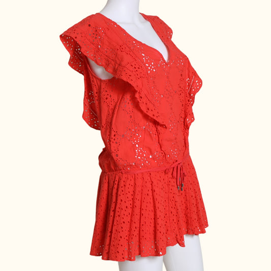 PARKER BEACH Red V-Neck Ruffled Cotton Mini Dress