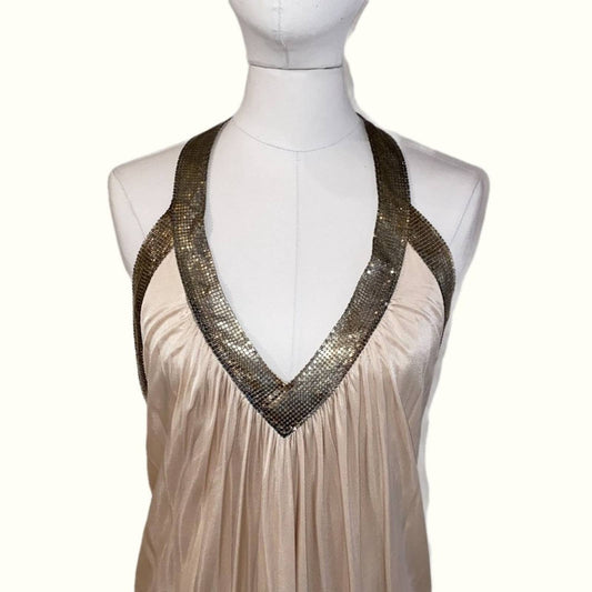 BCBGMAXAZRIA Beige and Gold Embellished Halter Backless Dress