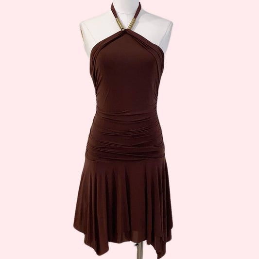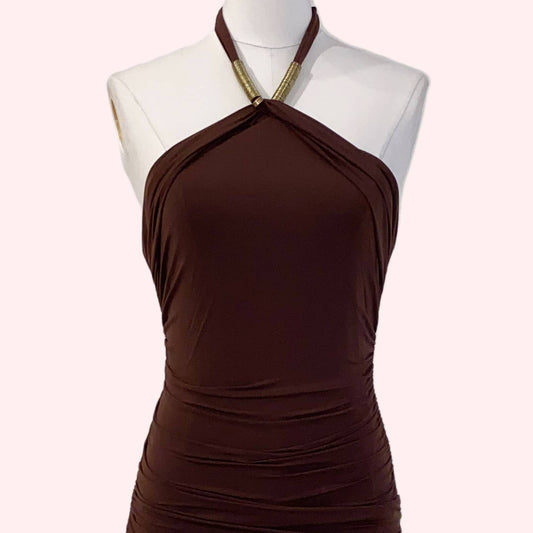 BCBGMAXAZRIA Brown with Gold Accents Mini Halter Dress