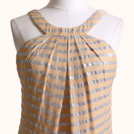 YIGAL AZROUËL Beige and Metallic Silver Striped Sleeveless Silk Dress