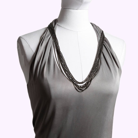 YIGAL AZROUEL Grey Rayon V Neck Dress with Chains