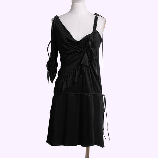 KAREN MILLEN Black One Shoulder Draped Silky Dress With Ribbons