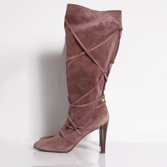 KURT GEIGER Dusty Rose Suede Leather Knee High Boot Strappy Heels