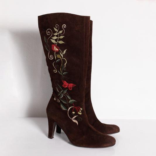 OFFICE LONDON Brown Suede with Multicolor Floral Embroidery Knee High Boot Heels