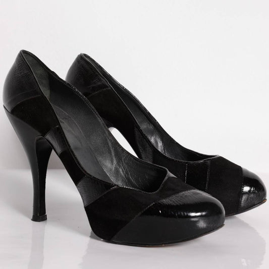 BARBARA BUI Black Patent Leather and Suede Open Toe Platform Pumps