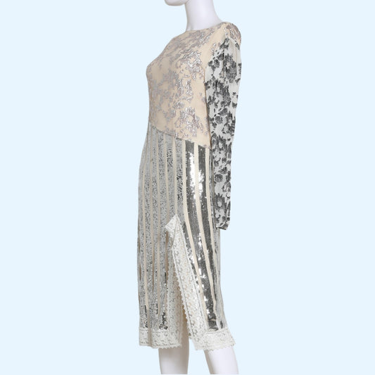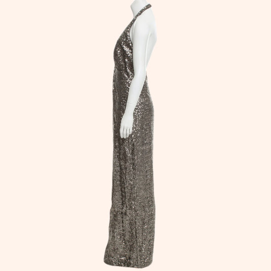 HALSTON Silver Sequin Evening Dress