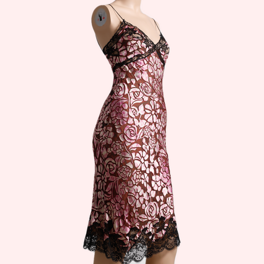 EMANUEL UNGARO PARIS Pink and Black Floral Lace Sleeveless Silk Midi Dress