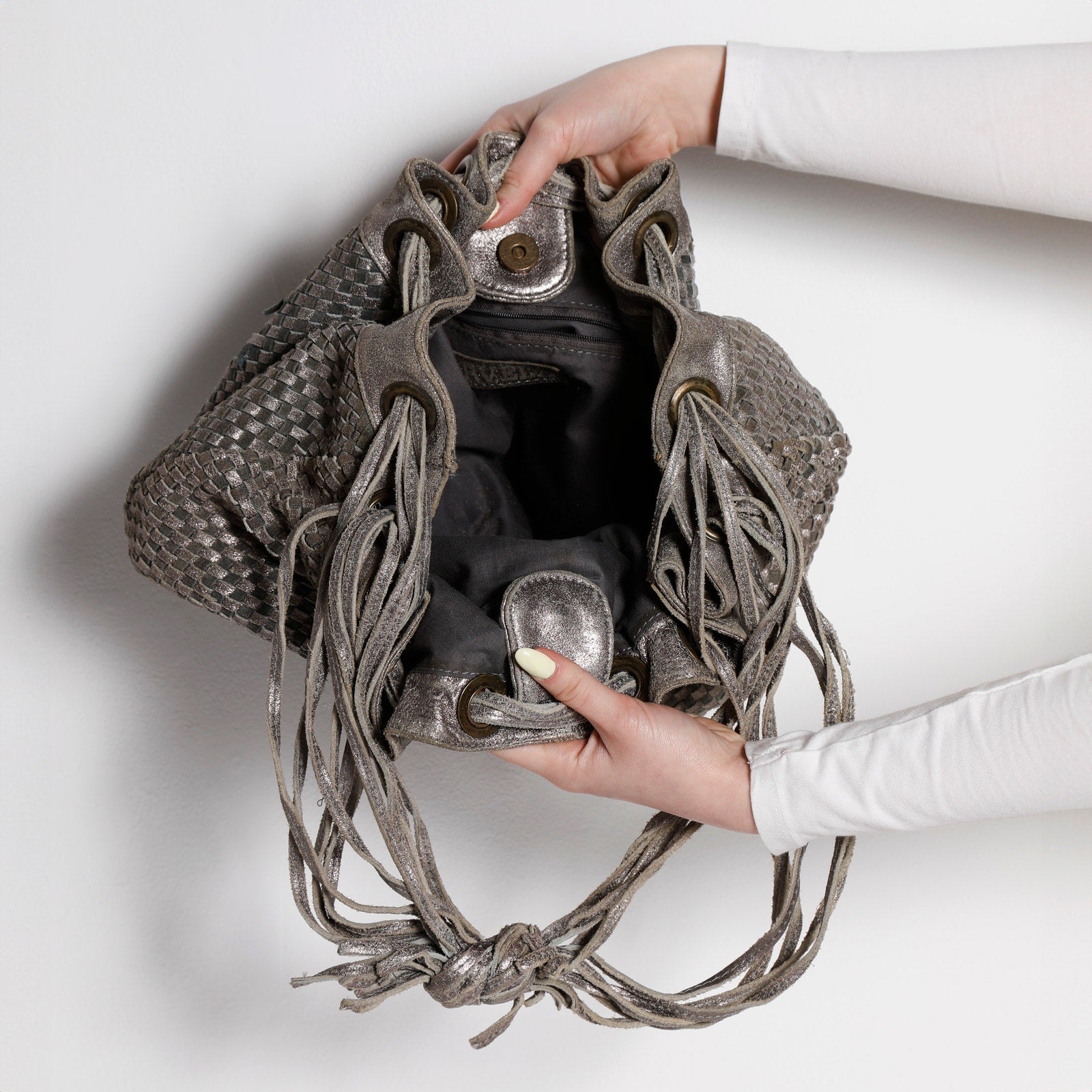 - Grey and Silver metallic woven leather