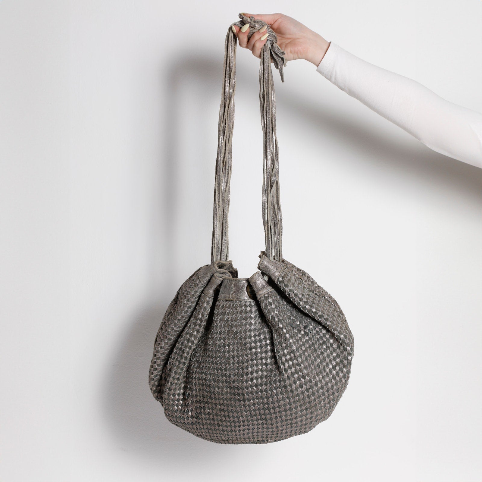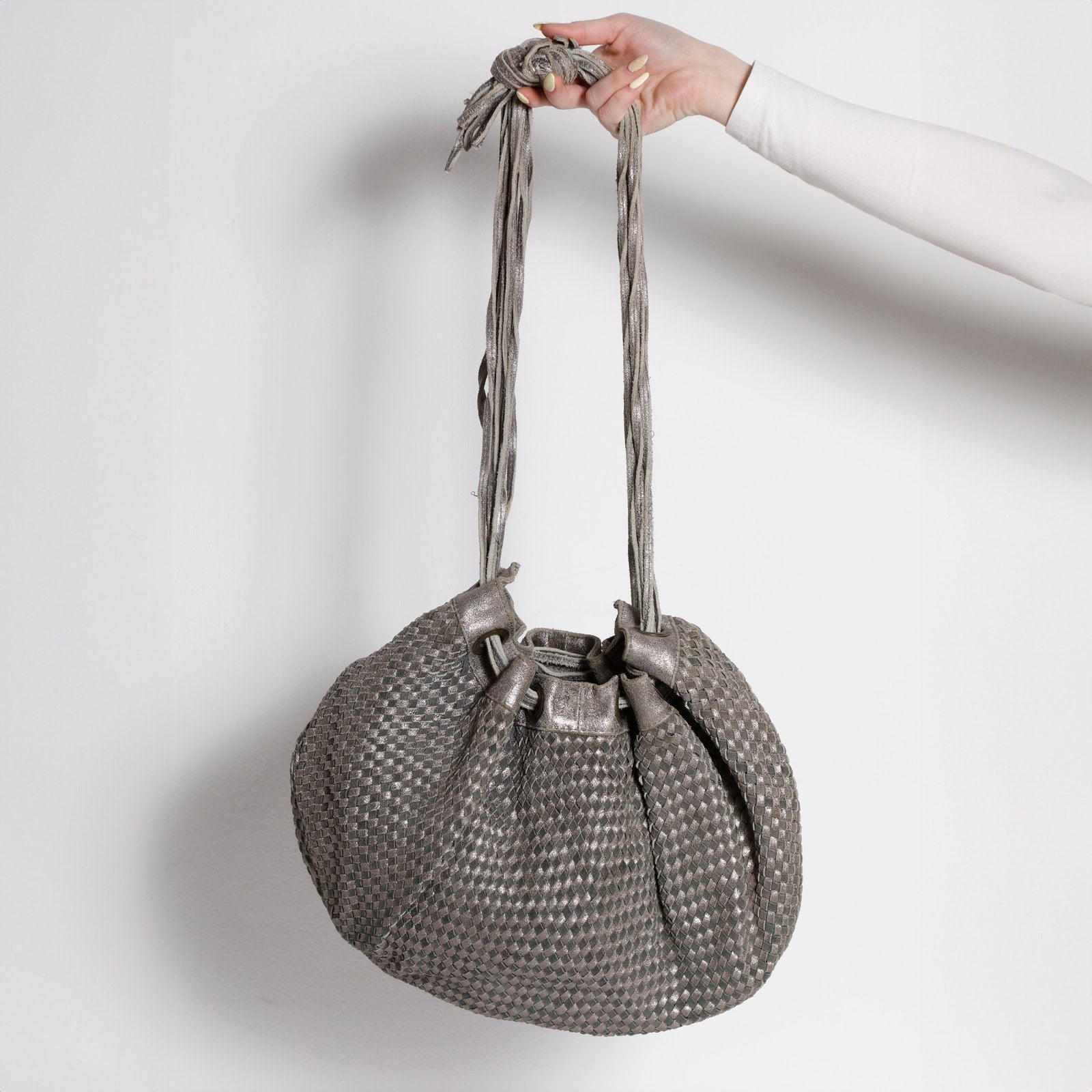Softly slouched vintage shoulder bag crafted in metallic woven leather, featuring a fully lined interior, adjustable knotted strap, and an effortless sculptural silhouette with subtle early-2000s edge