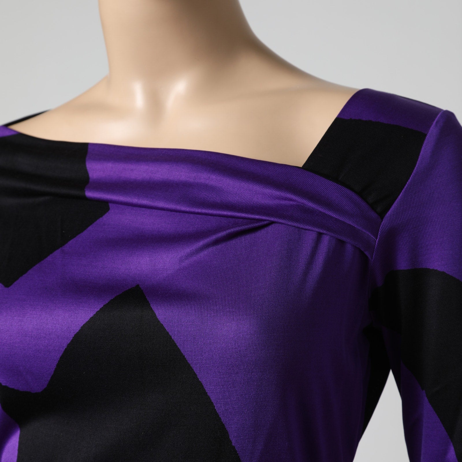 - Purple with black abstract geometric pattern, asymmetrical neckline, fitted silhouette