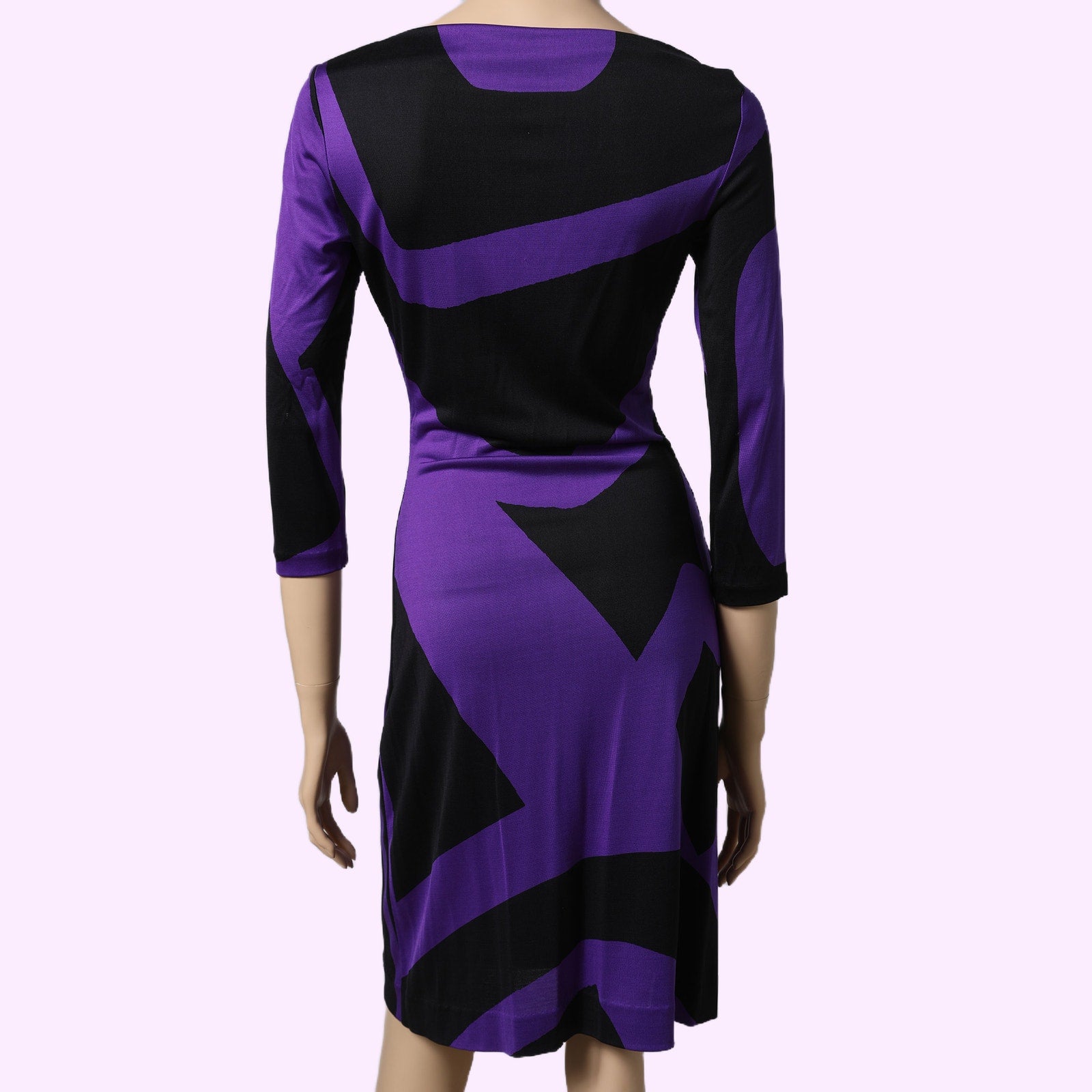 A striking Diane von Furstenberg silk knee-length dress featuring a bold purple and black abstract pattern with an elegant asymmetrical neckline for a sculpted, modern look.