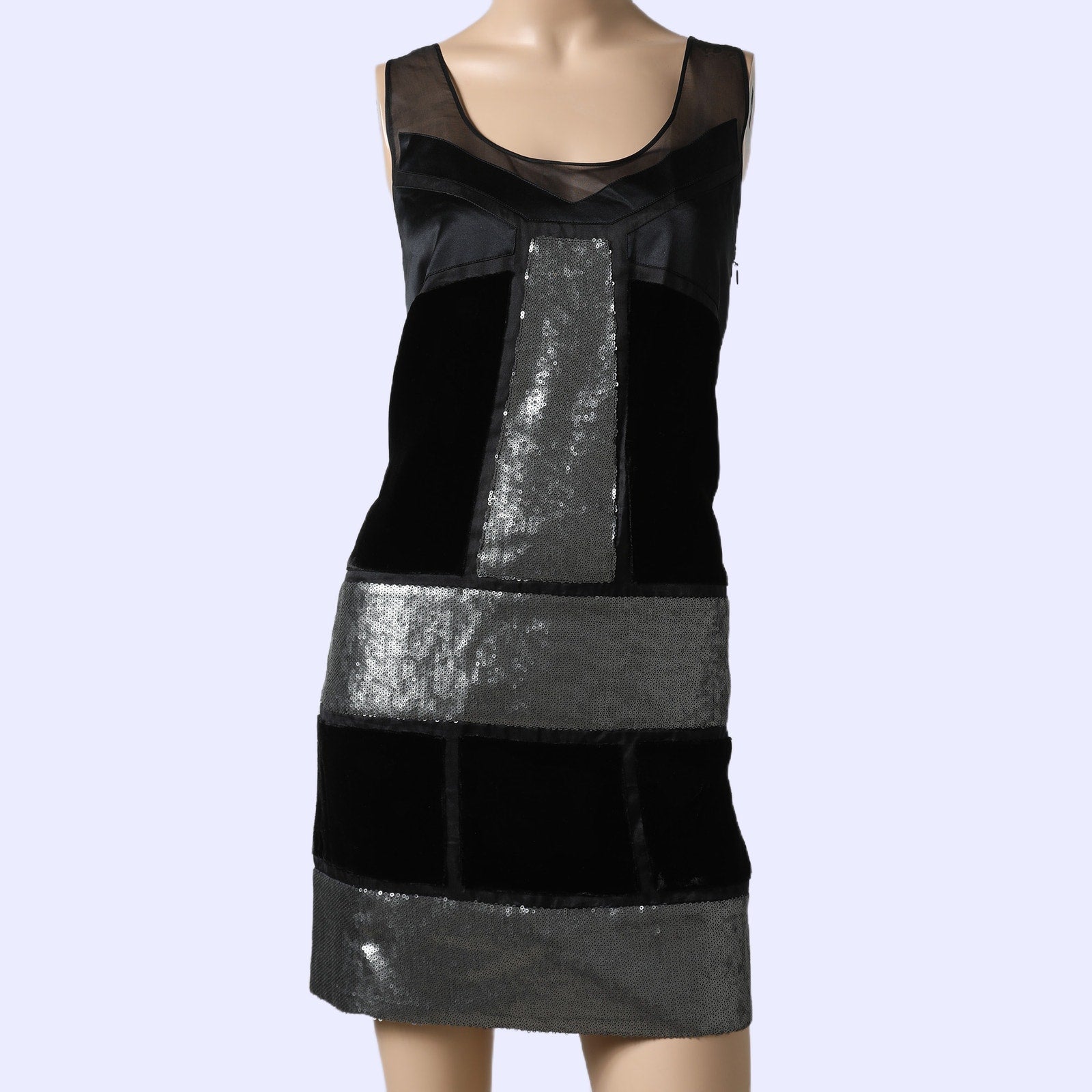 A sleek Diane von Furstenberg mini dress featuring luxe black velvet, sheer mesh, and silver sequin panels for a striking evening-ready silhouette.