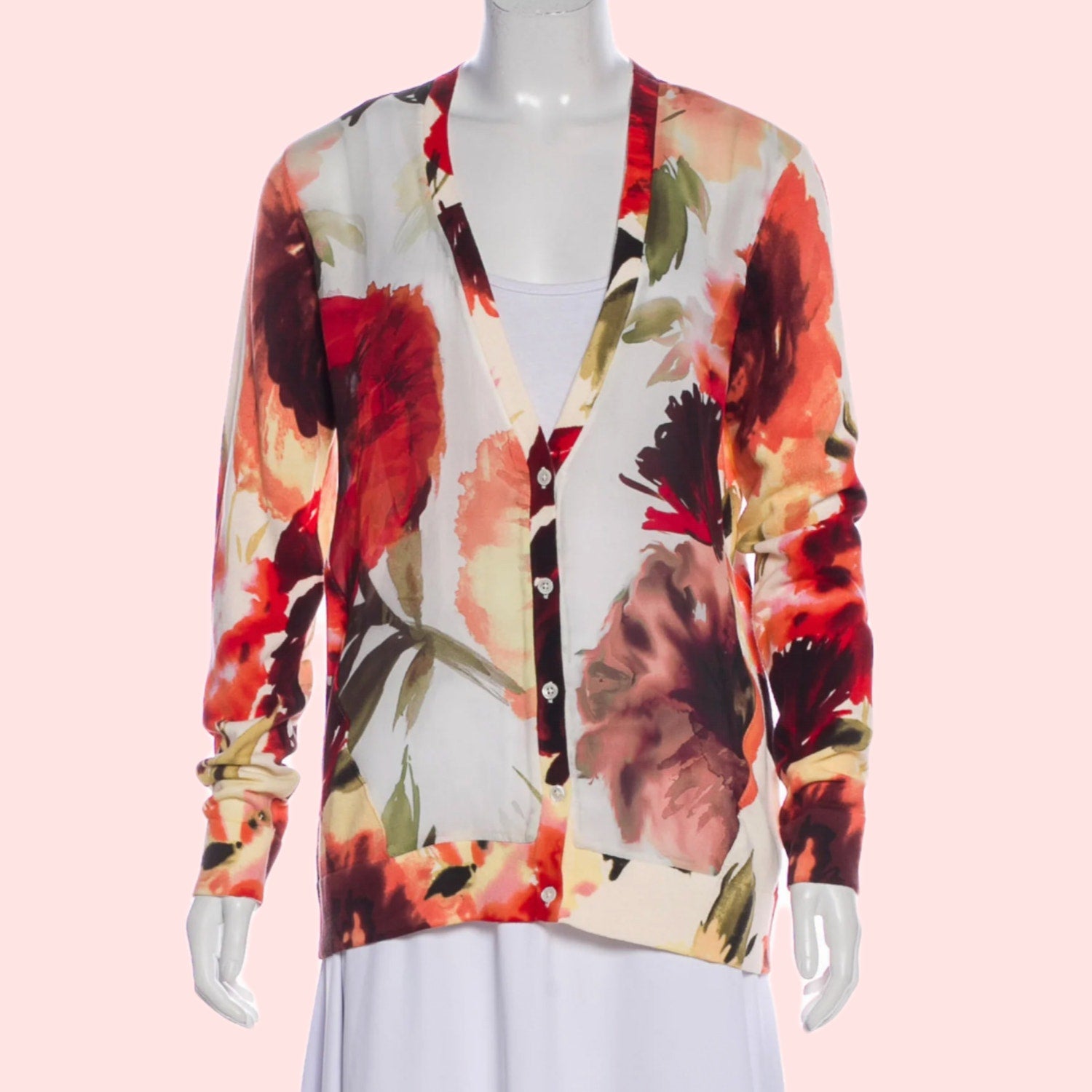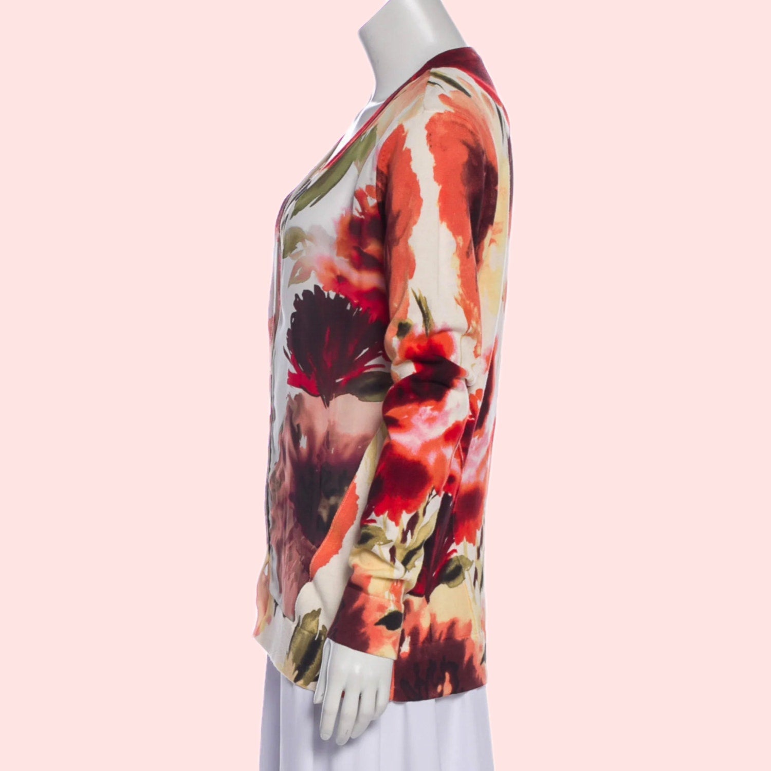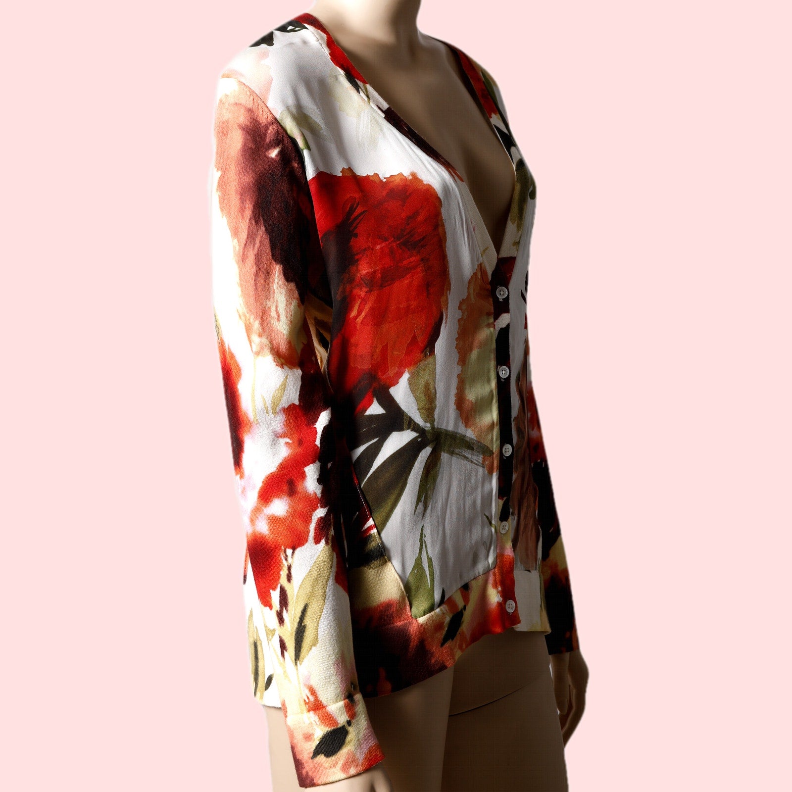 HAUTE HIPPIE Orange, Red, and Cream Silk Floral Printed Cardigan
