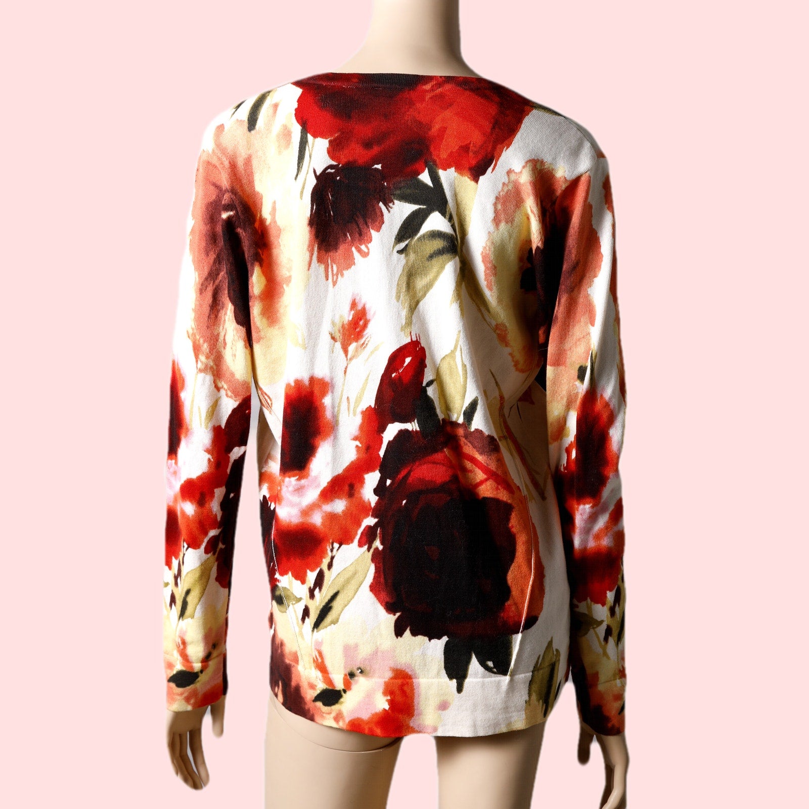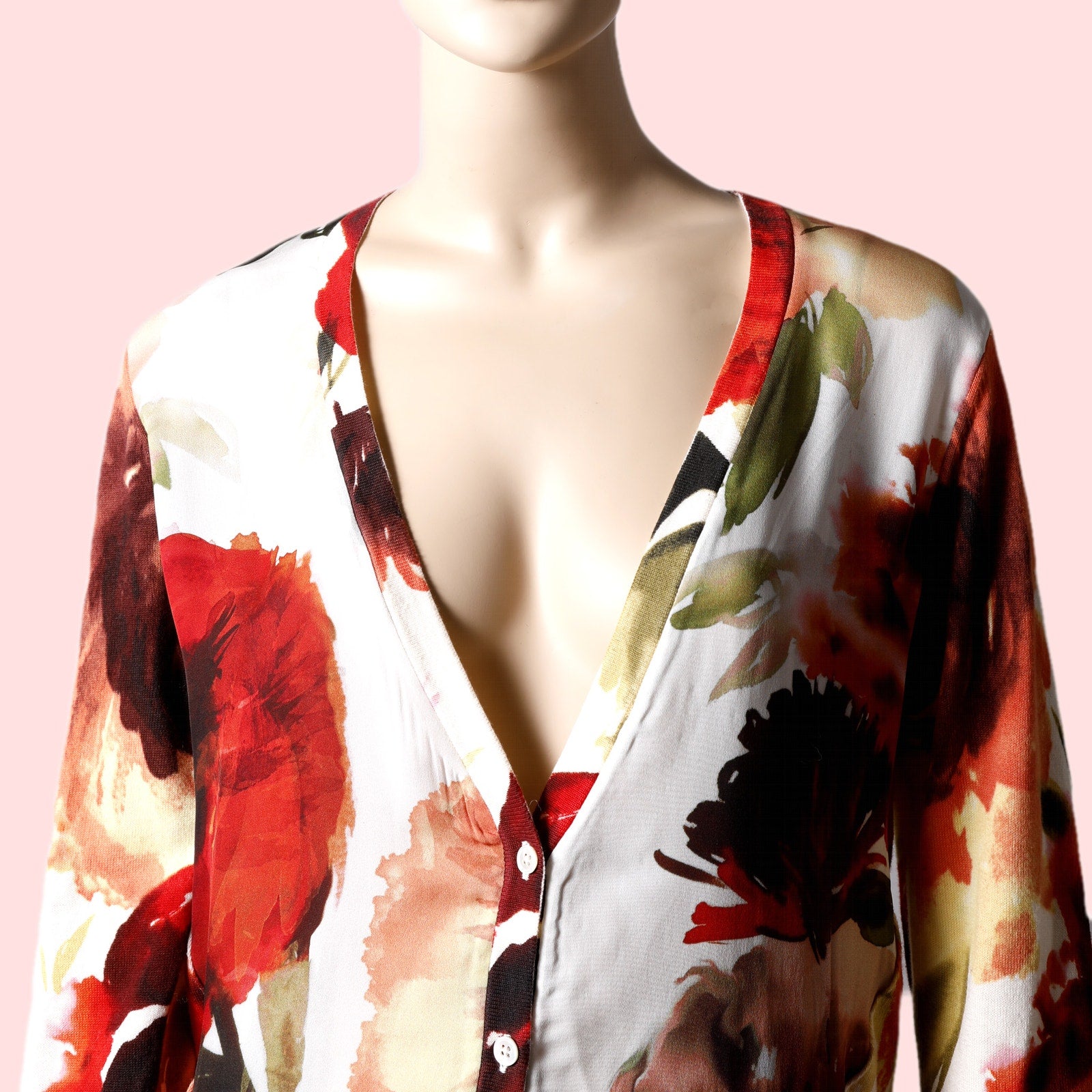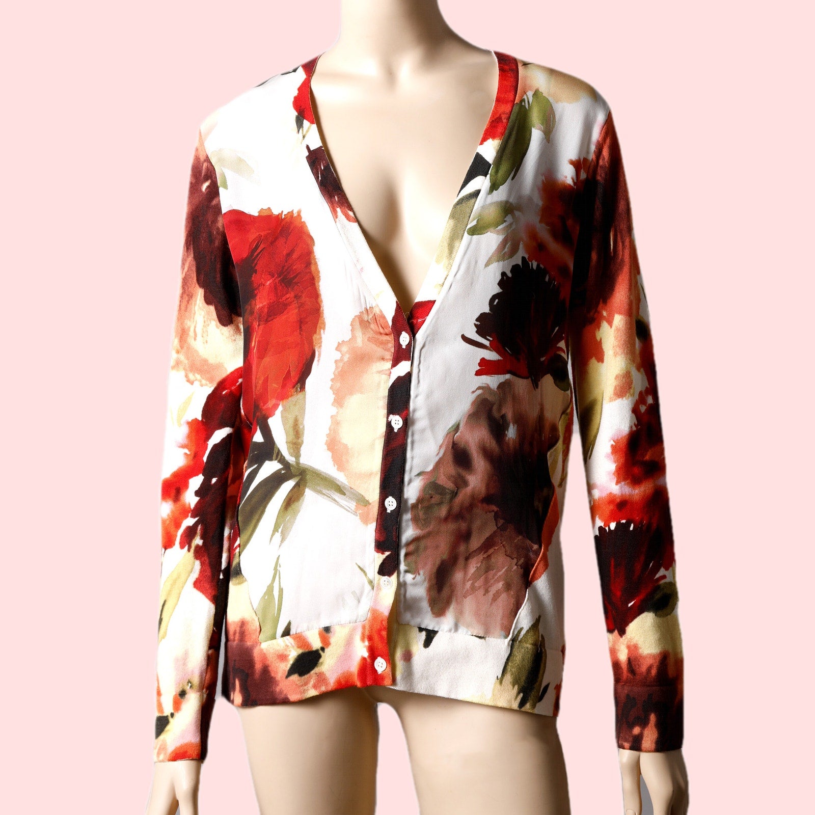 HAUTE HIPPIE Orange, Red, and Cream Silk Floral Printed Cardigan