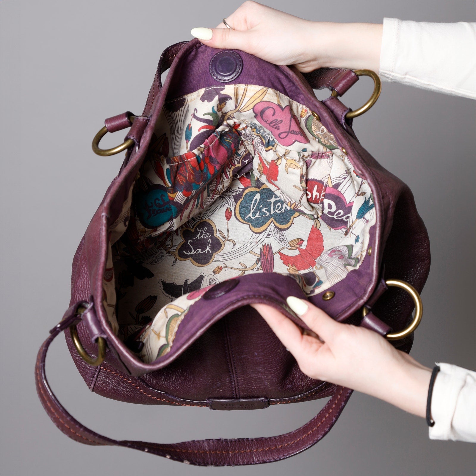 A timeless Vintage Y2K shoulder bag in supple burgundy leather with signature The Sak detailing — spacious, effortlessly chic, and easy to wear year-round.