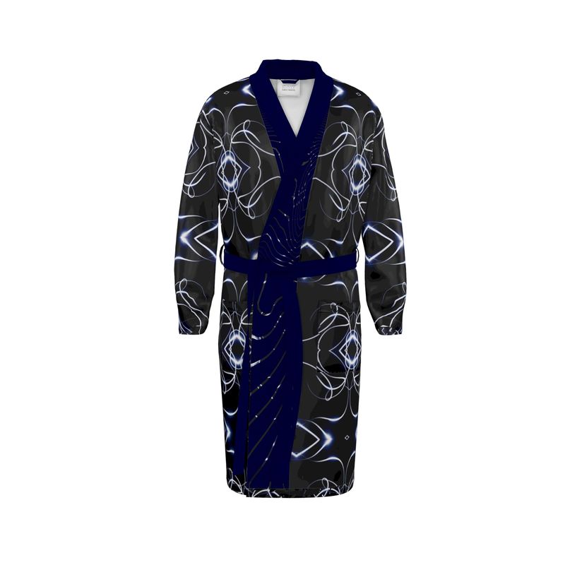 Our chic bathrobe / lounging robe is a limited edition garment exclusively made for our collection designed by artist Indira Cesarine using one of her unique light painting photographs on photo-printed fabric. The lounge robes are sustainably made in the UK and items are dispatched within 48 hours.