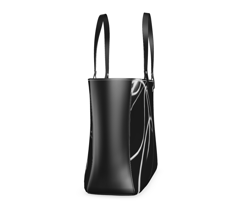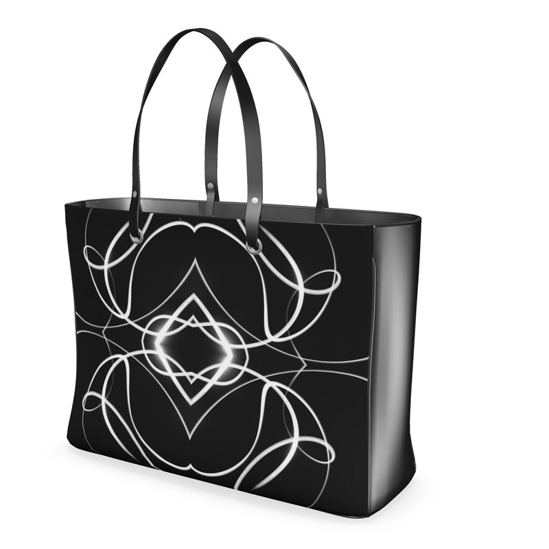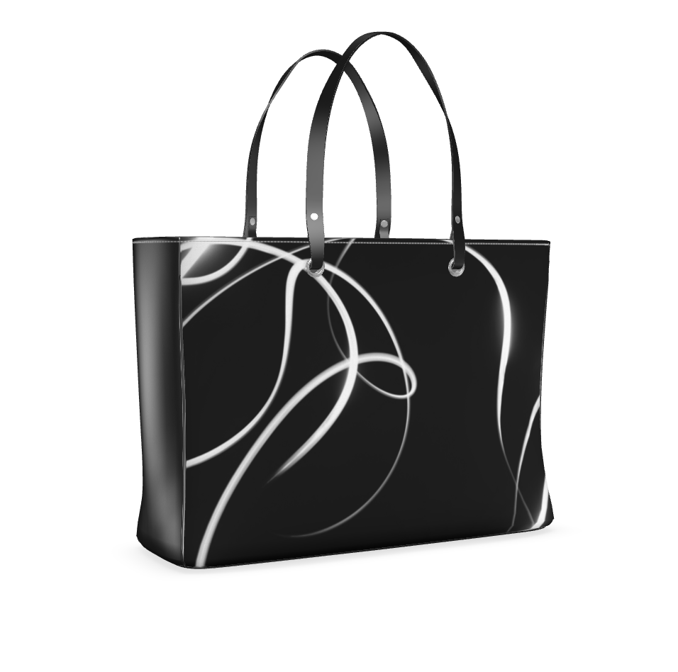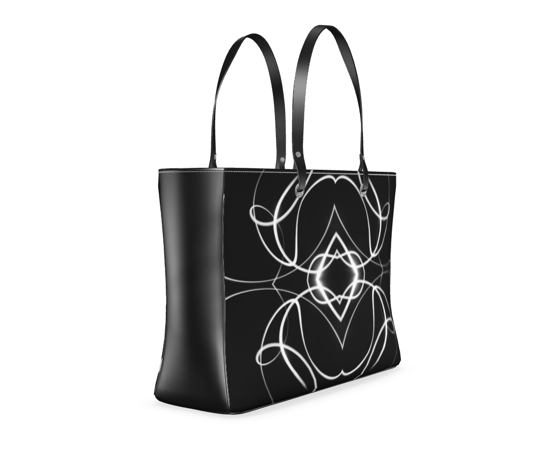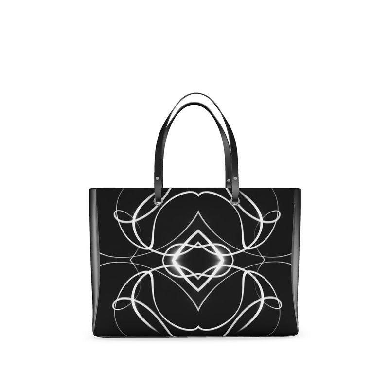 Our chic black and white kaleidoscopic handbag is a limited edition piece exclusively made for our women’s collection designed by artist Indira Cesarine using one of her unique light painting photograph on photo-printed fabric. The leather bag is sustainably made in the UK and items are dispatched within 48 hours.