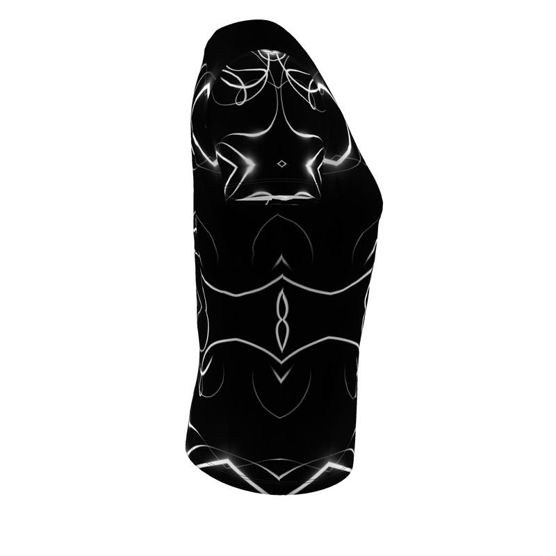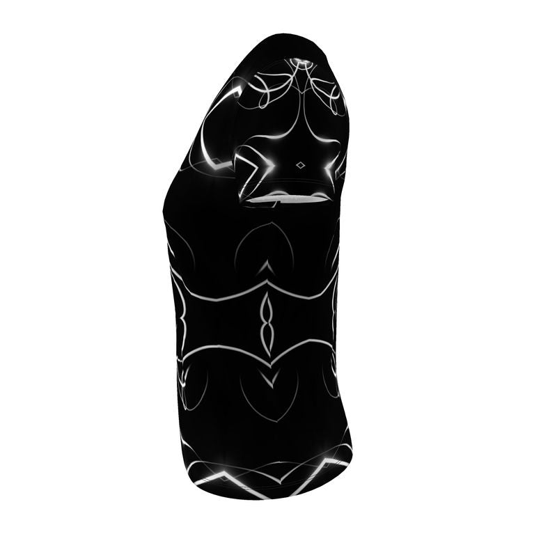 Our chic black and white kaleidoscopic T-shirt is a limited edition garment exclusively made for our women’s collection, designed by artist Indira Cesarine using one of her unique light painting photograph on photo-printed fabric. The comfortable jersey scoop neck T-shirt is sustainably made in the UK and items are dispatched within 48 hours.