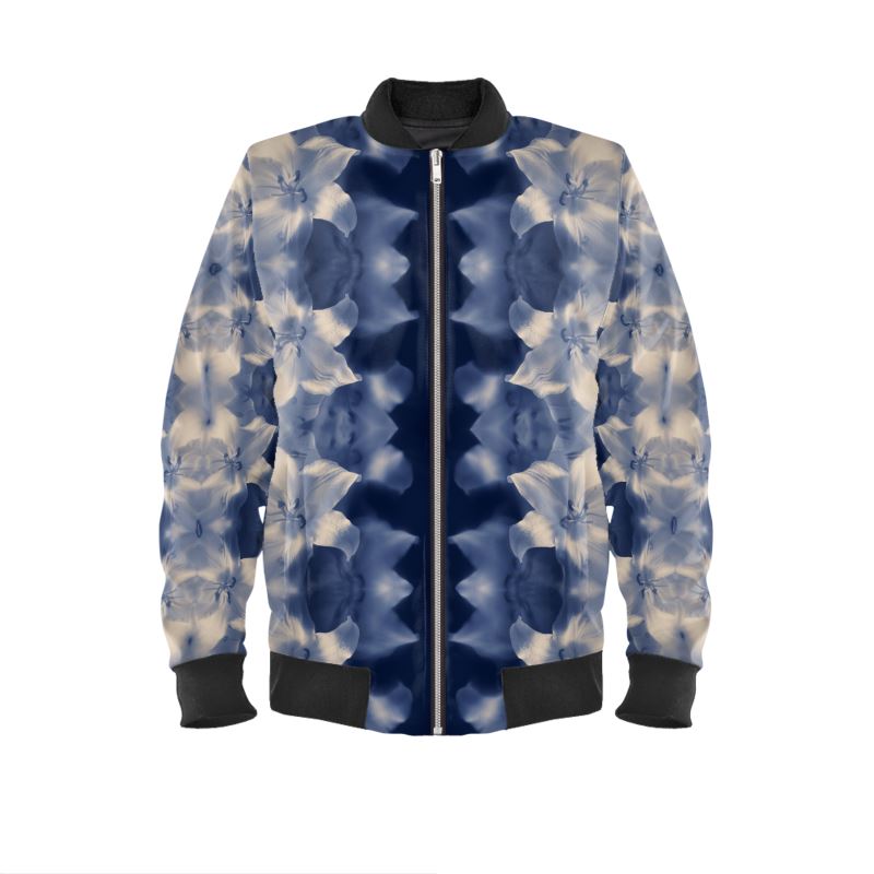 Indira Cesarine's "Blue Lillies" kaleidoscopic bomber jacket is a limited edition piece made exclusively for our women’s collection using one of her unique photographs on photo printed fabric. The ultra-chic bomber jacket is sustainably made in the UK and items are dispatched within 48 hours.