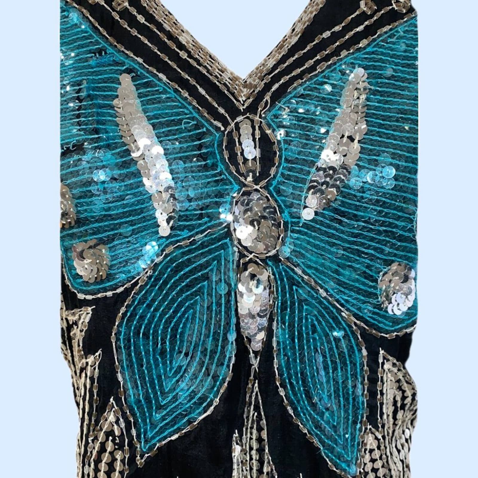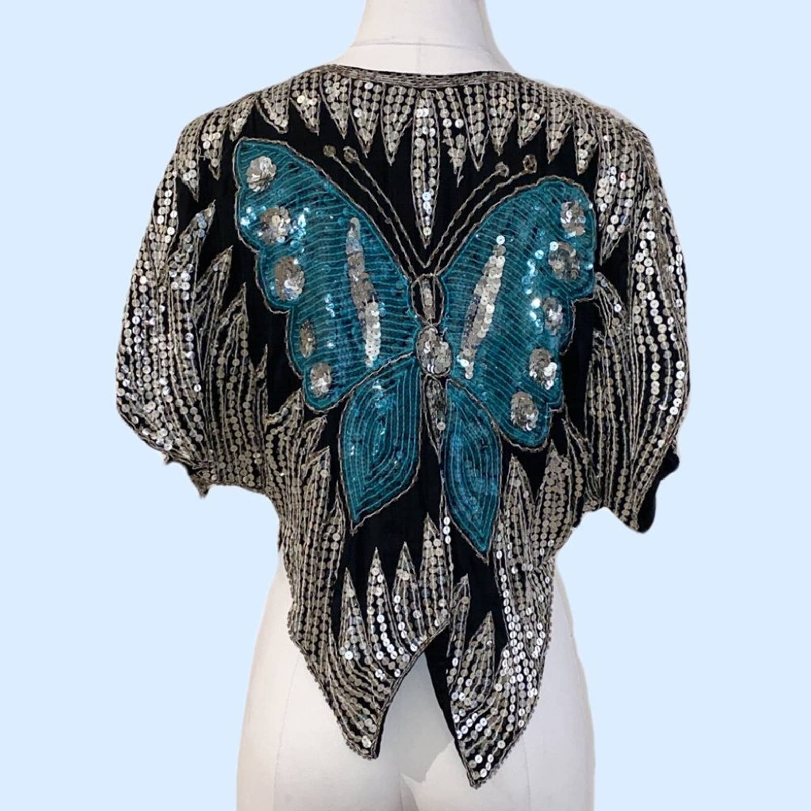 VINTAGE 1970s Silver and Blue Butterfly Sequin 1970s Short Sleeve Top